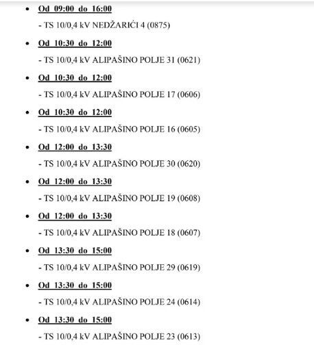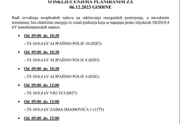 Radi izvođenja neophodnih radova na održavanju energetskih postrojenja, 5. decembra bez električne energije ostat će područja koja se napajaju preko sljedećih transformatorskih stanica.